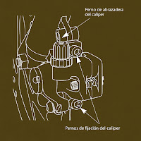 4.- Fijación del caliper: Usando guantes, presiones el adaptador hacia la izquierda mientras aprieta los pernos de abrazadera del caliper.